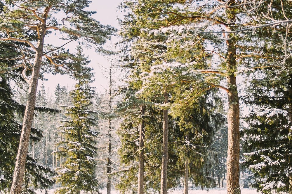 Sonniger Wald im Winter mit Schnee in der Landschaft