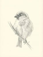 Spatz auf einem Ast ist eine detailreiche Bleistiftzeichnung eines männlichen Hausspatzen, der auf einem schlankten Ast sitzt und zur linken Seite schaut. Das zarte Gefieder und der aufmerksame Blick des Singvogels sind mit feinen Strichen eingefangen. Die Zeichnung wurde auf einem leicht cremefarben getönten Papier gezeichnet. Die…