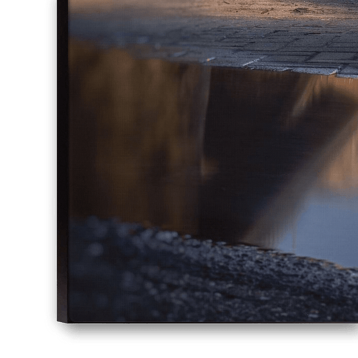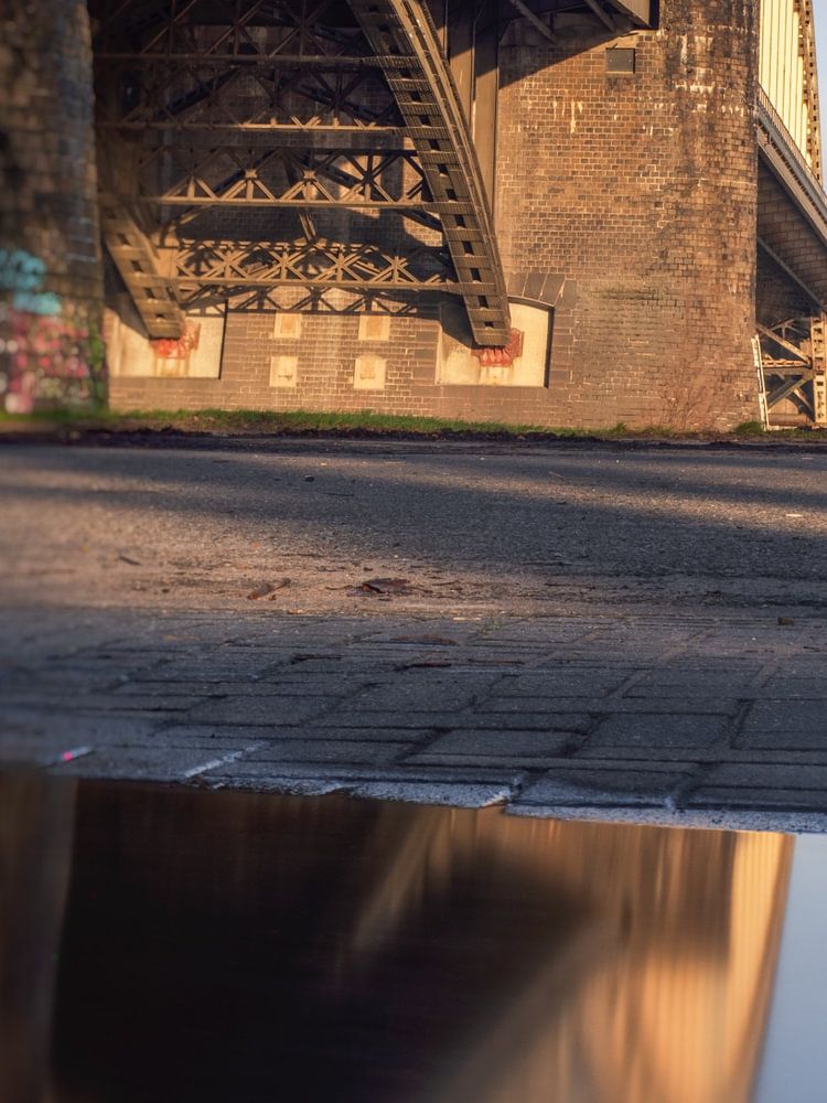 Die Waalbrücke bei Nijmegen. Eine Ikone der ältesten Stadt der Niederlande. Außerdem spielt diese Brücke immer noch eine wichtige Rolle für den Verkehrsfluss innerhalb von Nimwegen, obwohl sie teilweise von der zweiten Stadtbrücke De Oversteek übernommen wurde. Im Jahr 2020 wird daher mit dem Ausbau der Brücke begonnen, um den Verkehr schneller fließen zu lassen. Diese Brücke ist auch ein wichtiges Bindeglied während der viertägigen Feierlichkeiten, sowohl für die Wanderer als auch für die Feierlichkeiten, die unter der Brücke stattfinden. Dieses Foto wurde nach ein paar Tagen Regenwetter aufgenommen, daher gab es unter der Brücke Pfützen, die ich für ein Spiegelbild verwenden konnte. Da die Sonne noch tief stand, erhielt ich warme Farben und schöne Schlagschatten. Das Wetterspiel bildete einen nahezu perfekten Kreis.