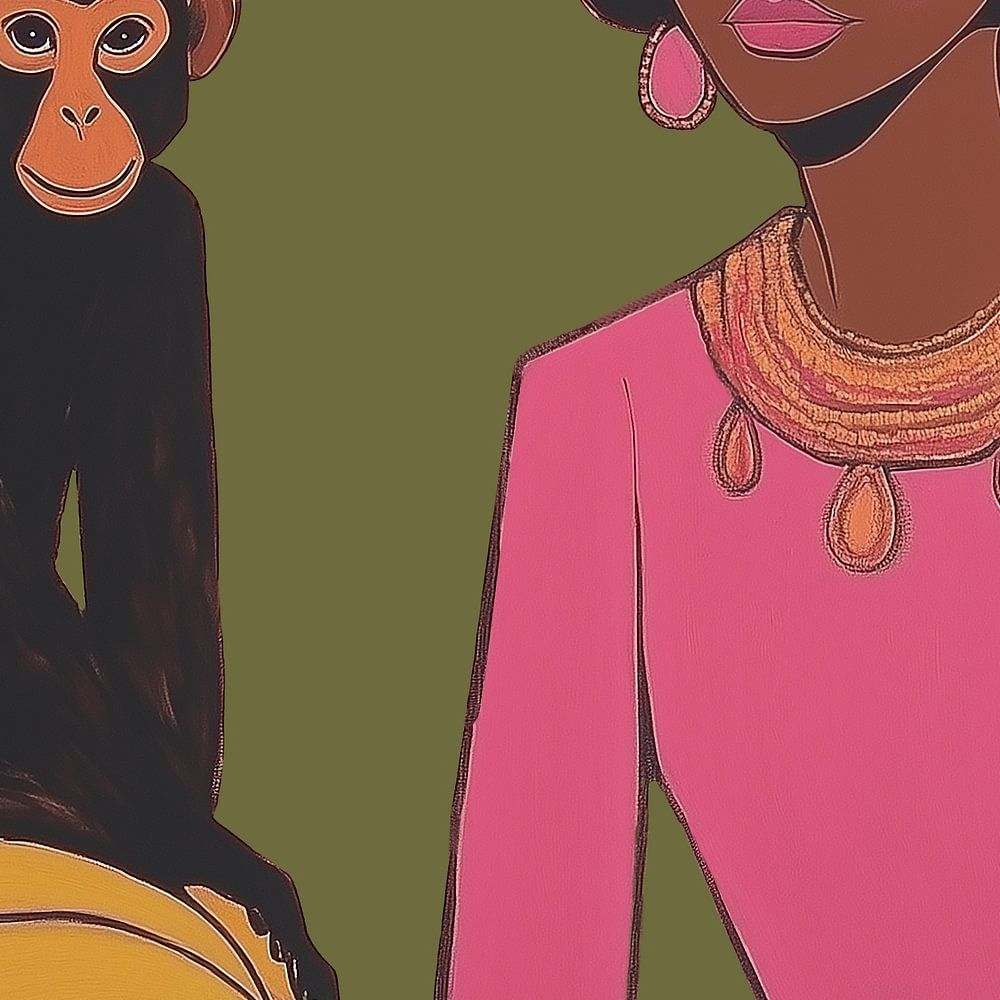 An ihrer Seite sitzt ein dunkelbraunes Äffchen mit neugierigen Augen und einem verspielten Lächeln. In seiner Hand hält er ein Bündel gelber Bananen, die einen lebhaften Farbkontrast zu den sanften Tönen der Frau und ihres Kleides bilden. Die Bananen scheinen fast ein spielerisches Element der Interaktion zu sein, wie eine Einladung zu einer leichten und unkomplizierten Verbindung zwischen den beiden.