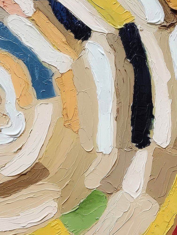 Eine abstrakte Spirale aus dicken, bunten Pinselstrichen, die die Energie und Spontaneität des Augenblicks einfangen. Jede Schicht scheint auf der Leinwand zu tanzen, wobei sich warme Erdtöne und leuchtende Farben in einem rhythmischen Spiel abwechseln. Dieses Kunstwerk lädt zur Interpretation ein und verleiht jedem Raum eine lebendige Note.