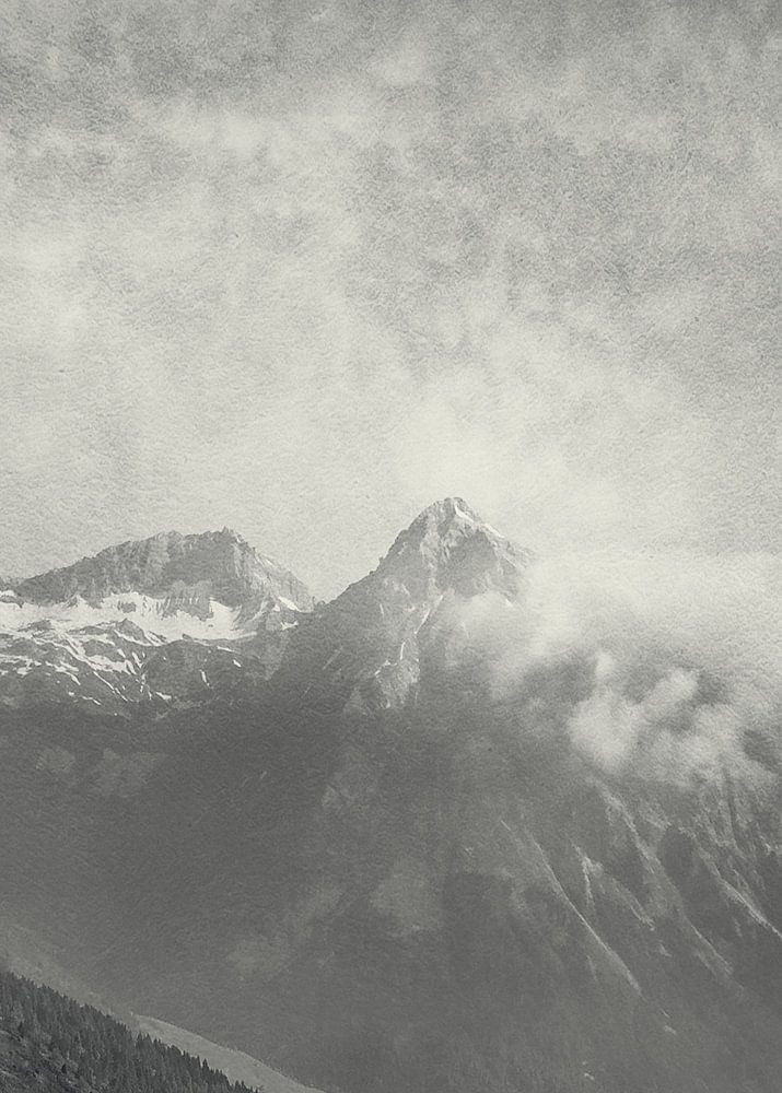 Blick auf das Suretta Joch und Piz Platta in den Schweizer Alpen, Kanton Graubünden. In schwarz-weiss konvertierte Fotografie, die mit Texturüberlagerungen editiert wurde.