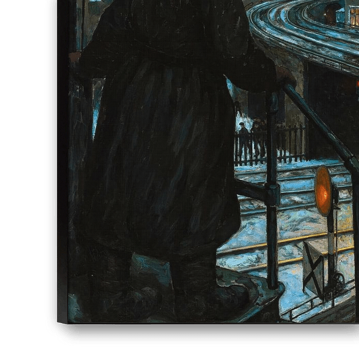 Im Zentrum der Komposition erhebt sich ein kolossaler Fabrikkomplex wie eine Festung, dessen imposante Strukturen die umliegenden Gebäude und Arbeiter in den Schatten stellen. Aus den Schornsteinen quellen dicke Rauchschwaden, die den Himmel verdunkeln und einen unheilvollen Schatten auf die Szene werfen. Die Fenster und Türen der Fabrik sind von innen beleuchtet, was auf die unablässige Aktivität und Arbeit innerhalb der Mauern hinweist. Im Vordergrund hat Baluschek eine schemenhafte Figur dargestellt, die in einem an den deutschen Expressionismus erinnernden Stil wiedergegeben ist.
