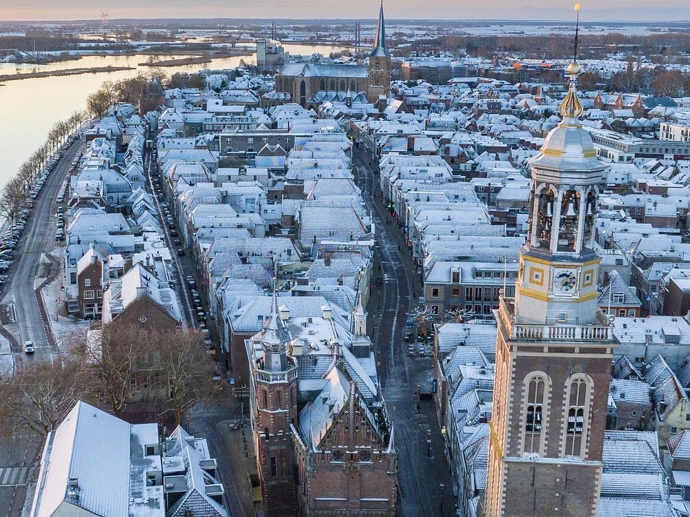 Bestelle dieses Landschafts-Wandbild Stadtansicht von Kampen mit dem Neuen Turm am Fluss IJssel während eines von Sjoerd van der Wal Fotografie als Reproduktion auf Leinwand, Alu-Dibond, als Poster, Fototapete oder Acrylglasbild.