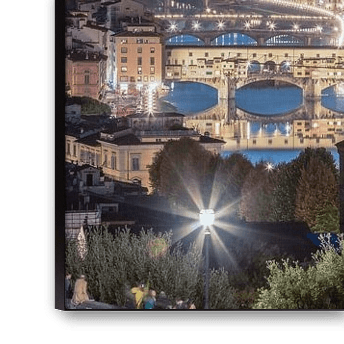 Blick auf die Altstadt von Florenz zur Blauen Stunde nach Sonnenuntergang. Zu sehen sind die Ponte Vecchio und der Dom von Florenz.