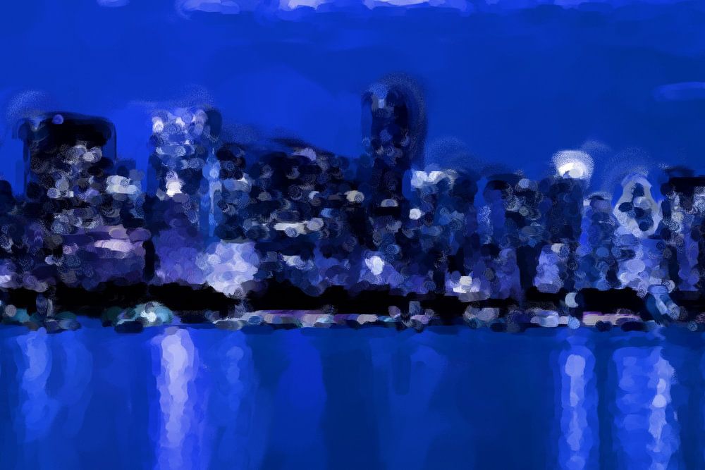 Stadtsilhouette bei Nacht mit Lichtreflexionen im Wasser digitale Acrylfarbenmalerei