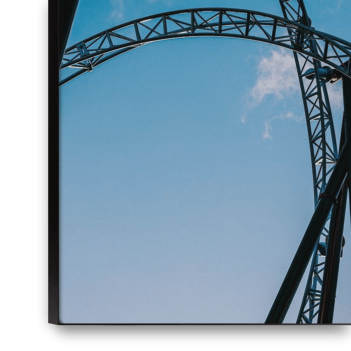 Elegante Stahlkurven schneiden durch den Himmel: eine minimalistische Detailaufnahme einer Achterbahn, die Bewegung, Technik und Leichtigkeit vereint. Markantes Wandbild für moderne Wohnungen, Büros und Ateliers – ideal für Fans von…