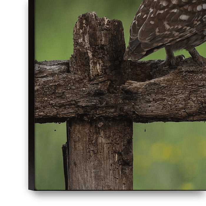 Steinkauz auf altem Zaun, das Foto ist etwas dunkel aufgenommen, damit das Licht auf der Eule gut zur Geltung kommt.