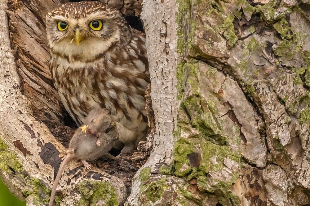 An einem schönen Sommerabend hatte ich die Gelegenheit, Steinkäuze zu fotografieren. Sie leben in einer Baumhöhle, wo sie mit der ganzen Familie leben. Normalerweise in einer Umgebung, in der es reichlich Beute gibt, wie zum Beispiel in der Nähe eines Bauernhofs, wo es viele Mäuse und Maulwürfe gibt. Die Ställe und Weiden bieten reichlich Beute. Sie fliegen von einem Baum herunter und stürzen sich auf ihre Beute. Außerdem gibt es alte authentische Zäune und Pfähle, an denen sie ihre Beute fressen oder einfach nur eine Weile darauf sitzen.