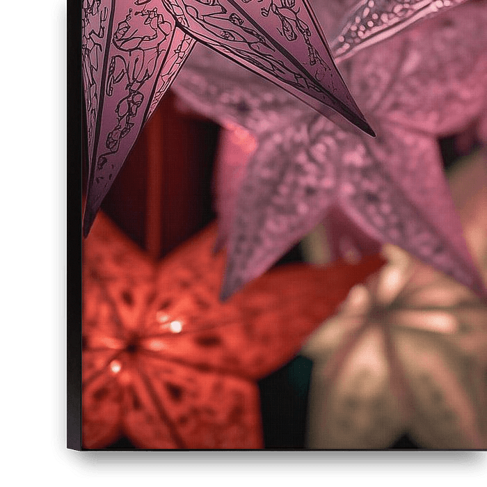 In einem Meer von Farben schweben unzählige Papiersterne, jeder mit seinem eigenen Glanz und Charakter. Ihre zarten Muster lassen ein warmes, gefiltertes Licht durch, als würden sie der Nacht Geheimnisse zuflüstern. Rot, Grün und Rosa verschmelzen zu einem bezaubernden Spiel aus Licht und Schatten. Jeder Stern scheint zu atmen, sanft…