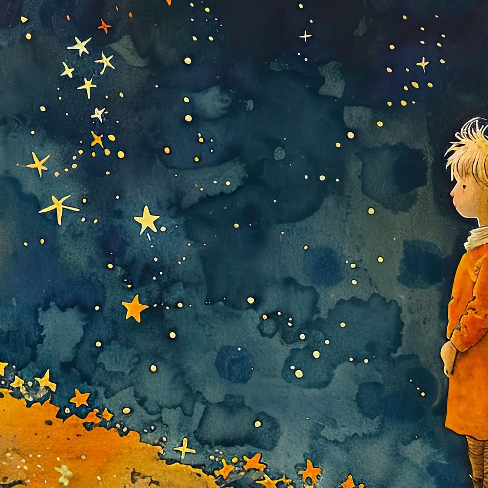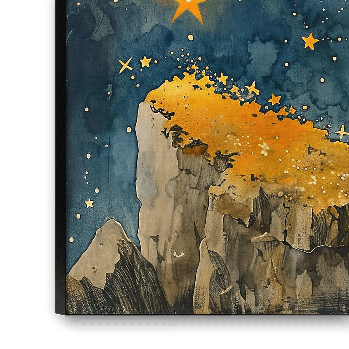 Diese Illustration zeigt ein Kind auf einem felsigen Hügel. Es blickt auf den hellen Sternenhimmel voller leuchtender goldener Sterne. Ein größerer Stern leuchtet hell in der Nähe. Die Farben des Himmels reichen von tiefem Nachtblau bis zu goldenen Tönen und schaffen eine magische und bezaubernde Atmosphäre.
