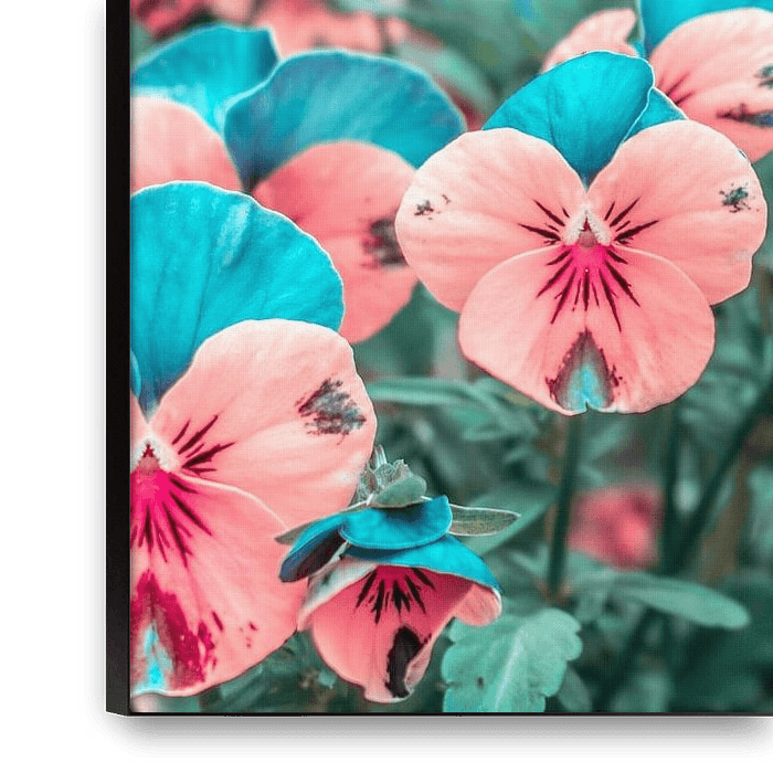 Das Bild zeigt ein dicht bepflanztes Feld von Stiefmütterchen (Viola ×wittrockiana) mit Blüten in leuchtenden Blau- und Rosatönen. Die Blüten sind eng aneinandergereiht, wodurch eine intensive, fast mosaikartige Farbfläche entsteht. Die Kombination aus kühlen und warmen Farbtönen erzeugt eine visuelle Spannung, die das Bild lebendig und…