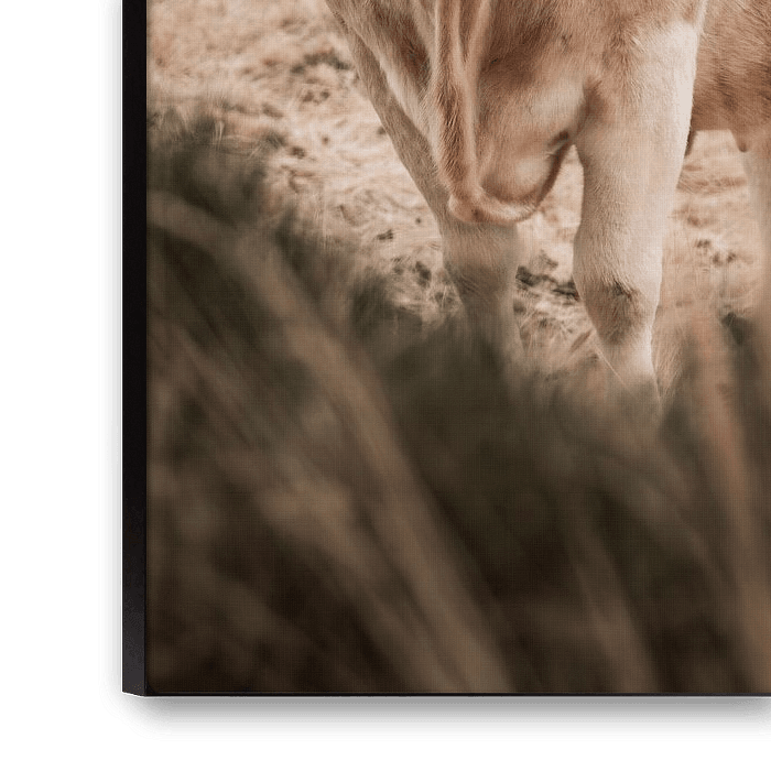 Dieser beeindruckende Stier steht stolz inmitten einer natürlichen Landschaft in sanften Erdtönen. Sein helles Fell kontrastiert subtil mit dem trockenen Gras und dem felsigen Hintergrund, während sein durchdringender Blick ein Gefühl von Präsenz und Entschlossenheit vermittelt. Die Komposition fängt sowohl die Stärke als auch die Gelassenheit des Tieres ein, mit einem Auge für Details in Textur und Form. Perfekt für Liebhaber ländlicher Themen und rustikaler Naturfotografie.