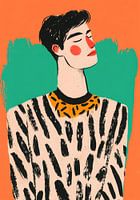 Die Illustration zeigt eine Person mit kurzem, leicht zerzaustem, schwarzem Haar, leicht nach rechts gedreht und mit geschlossenen Augen. Die Haut ist hell, die Lippen sanft rot betont, und ein dezenter roter Akzent erscheint auf der Wange. Die Person trägt einen weißen Pullover mit schwarzen Pinselstrichmustern und einem markanten,…