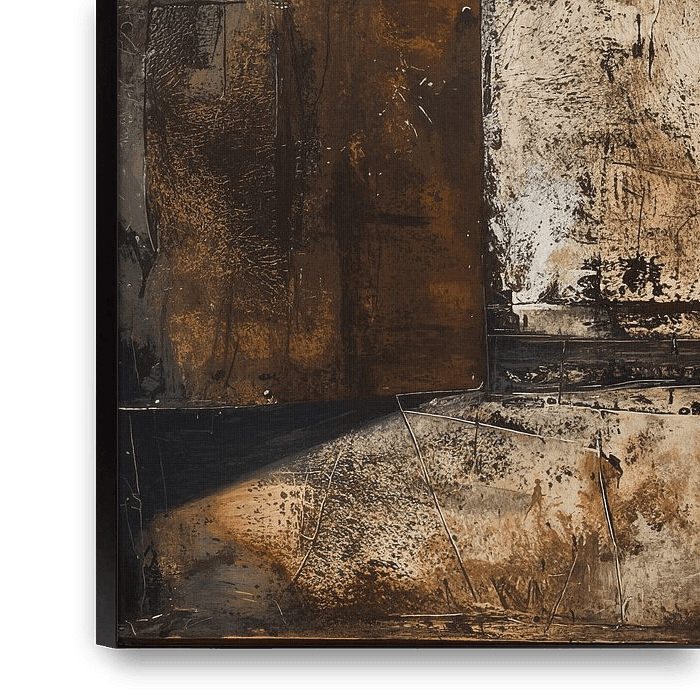 Silent Contemplation | Abstract Woman - Dieses Kunstwerk besticht durch seine satte, erdige Farbpalette, in der Braun- und Bronzetöne vorherrschen. Das Gemälde zeigt eine weibliche Silhouette im Profil, durchdrungen von Nostalgie und Introspektion, vor einem Hintergrund aus abstrakten Elementen und Texturen, die einen verwitterten und…
