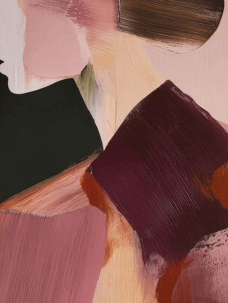 Quiet Confidence fängt die Schönheit der Einfachheit ein: eine Frau im Profil, aufgebaut aus weichen Pinselstrichen und erdigen Tönen von Altrosa, Karamell und Bordeaux.