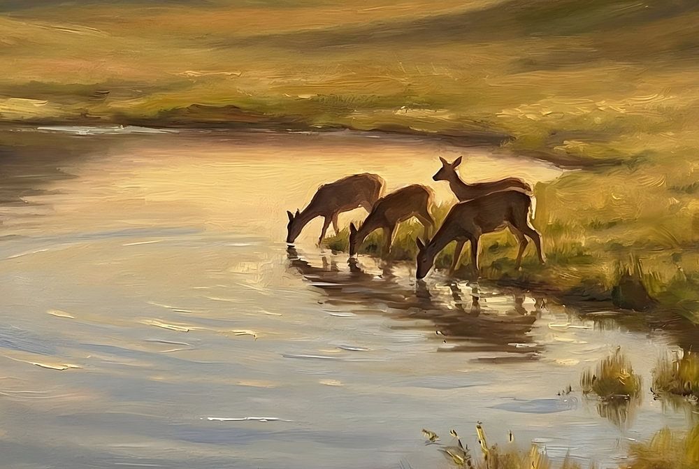 Eine warme und stimmungsvolle gemalte Landschaft im klassischen Ölgemälde-Stil. In der Ferne trinkt ein Paar eleganter Hirsche friedlich am Ufer eines ruhigen Sees, während weiches goldenes Licht die Landschaft erwärmt. Ein kleiner Junge in einer roten Jacke läuft durch das Feld im Hintergrund und fügt der ruhigen Natur eine subtile…