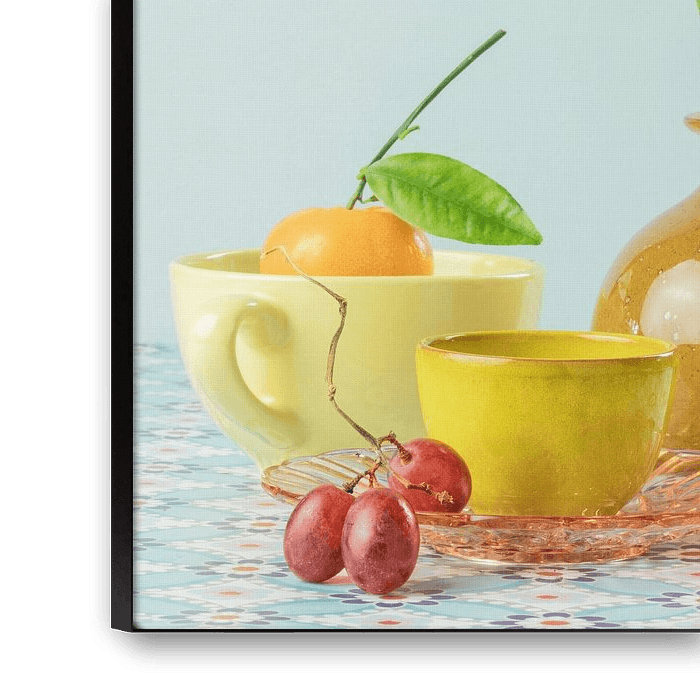Vertikales Stilleben mit einem altrosa Glasteller mit einer kleinen gelben Schale darauf, sowie einer hellgelben Tasse und einer bernsteingelben Glasvase. Gemeinsam auf einer Retro-Tischdecke vor einem meergrünen Hintergrund. Eine Mandarine, eine knospige Ranunkel und ein Zweig roter Trauben machen das Ganze verspielt.