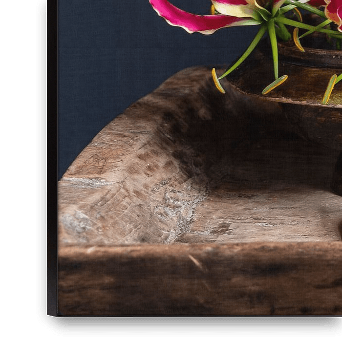 Stilleben auf einer Holzschale mit Gloriosa (rote Kletterlilie) in einer ladakhischen Schale und geschälter Zitrone