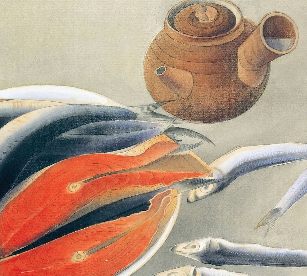 Stillleben - Lachsscheiben und Sardinen, Tsuchida Bakusen (1924)