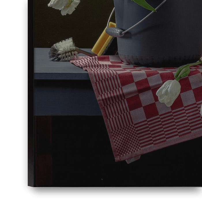 Vertikale Stilllebenfotografie mit einem großen Augenzwinkern. Eine bunte Sammlung von Tulpen in einem dunkelgrauen Eimer oder ein typisch holländisches Küchentuch auf dem Tisch mit Spülbürste und Scheuerschwamm. Alles vor einem dunklen Hintergrund in der Tradition der alten Meister.