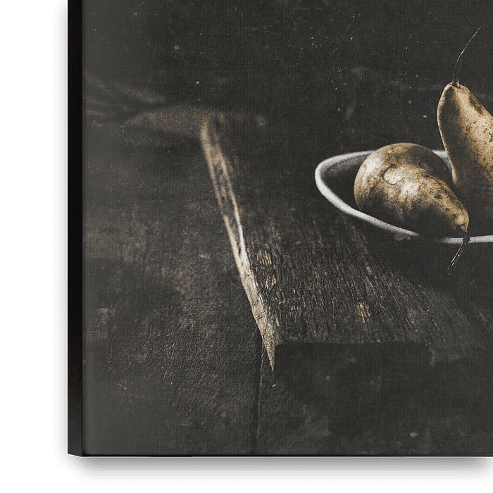Zwei Birnen in einem kleinen Schälchen auf einem Holzbrett. Der Hintergrund ist dunkel. Der Blick des Betrachters soll ganz von den zwei Birnen eingenommen werden, nichts soll ablenken.