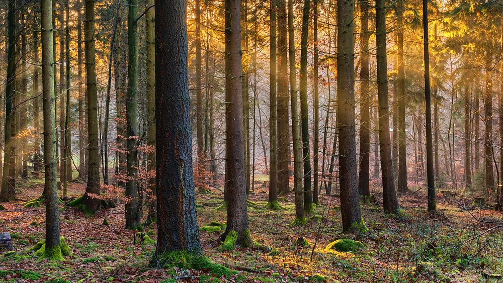 Die tiefstehende Herbstsonne sendet ihre Strahlen in den leichten Dunst eines Herbstwaldes