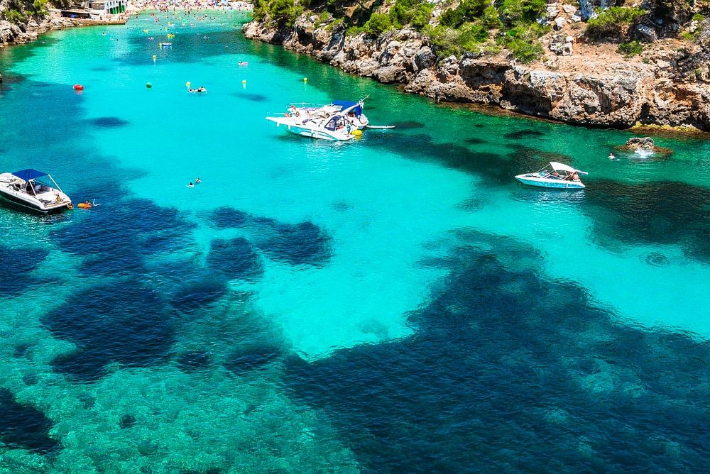 Idyllischer Blick auf den wunderschönen Strand Cala Pi auf der Insel Mallorca, Spanien Mittelmeer