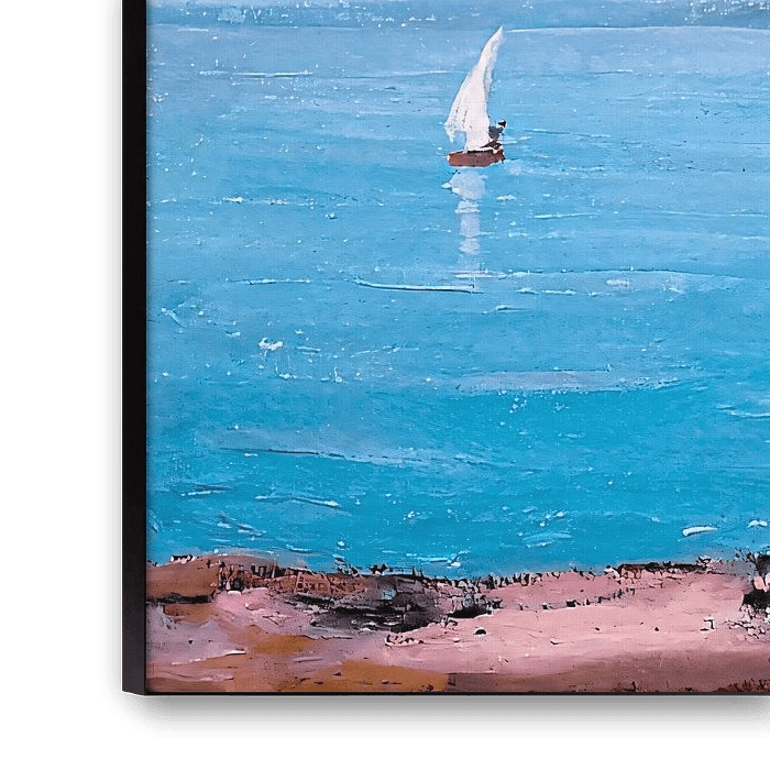 Die Komposition wird von einem prächtigen Kirschblütenbaum in voller Blüte beherrscht, dessen zartrosa Blüten in einem üppigen und poetischen Schauspiel über die Leinwand fallen. Der knorrige Stamm und die Äste des Baumes sind mit einem Gefühl von Energie und Bewegung wiedergegeben und bilden einen auffälligen Kontrast zum ruhigen, azurblauen Wasser des Ozeans im Hintergrund.