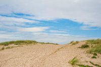Strandopgang van waddeneiland Ameland. Blauwe lucht met lichte wolken. Duinen en helm.