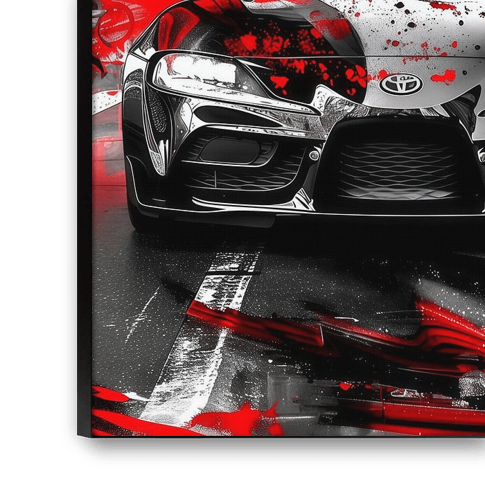 Eine lebendige geteilte Grafik eines Toyota Supra (A80). Die linke Seite ist ein intensives Neongrün, kontrastiert durch eine dynamische, dunkle Zebra-Streifen-Muster auf der rechten Seite, vor einem schwarzen und lindgrünen Hintergrund gesetzt. Merkmale "GATEBIL" auf der Windschutzscheibe.