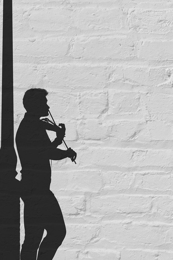 Wir sehen die Silhouette eines Straßenmusikers, der an einem Laternenpfahl lehnt und Geige spielt. Das Werk ist auf einer Textur einer weißen Ziegelwand platziert. Diese Textur setzt sich in den schwarzen Teilen des Werks fort.