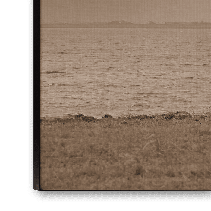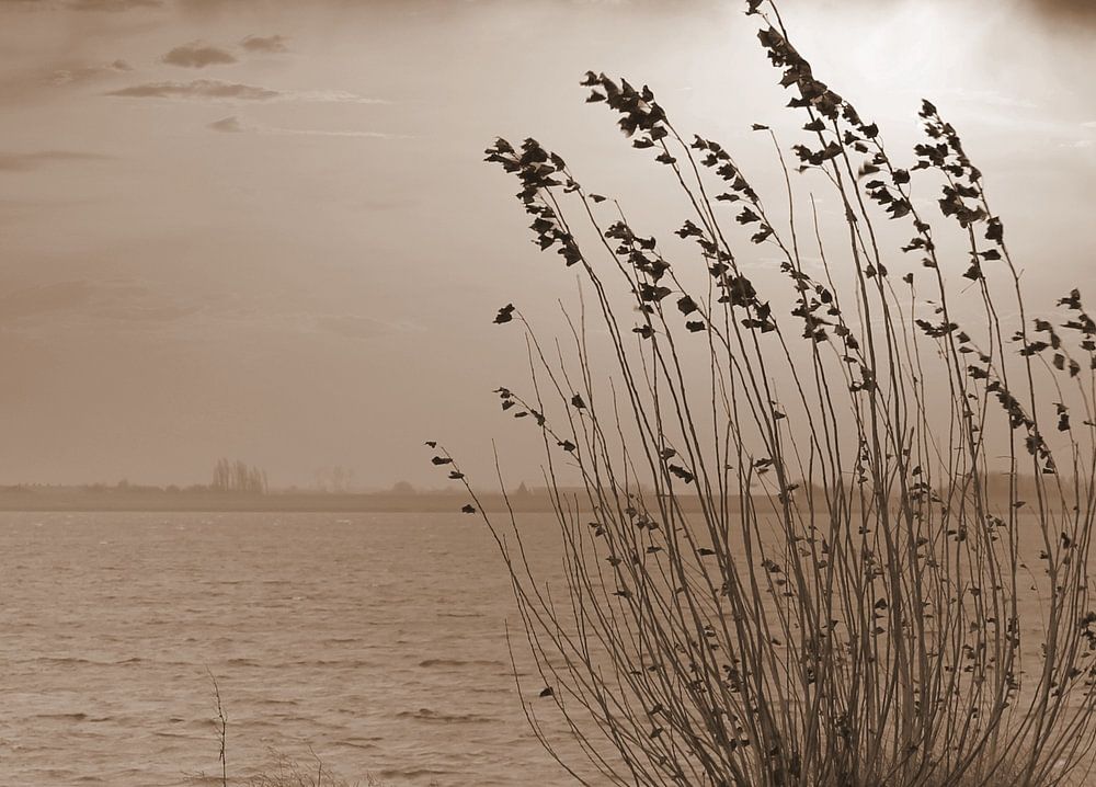 Ein schöner ruhiger Ort in Zeeland mit einem dunklen Wolkenhimmel in Sepia.