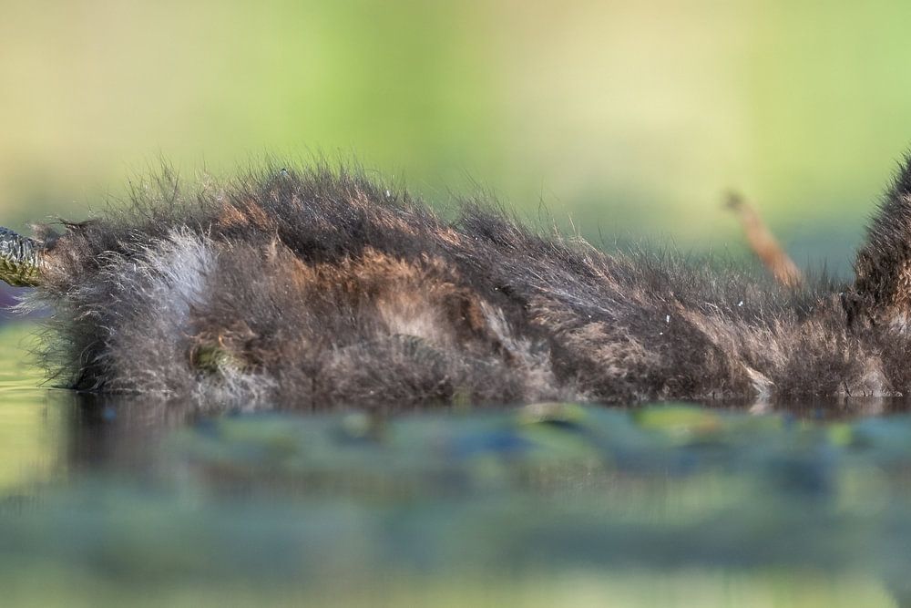 Junger Zwergtaucher, der seine Beine im Abendlicht ausstreckt, bereit, schnell zu den Eltern zu schwimmen, wenn diese mit einem Fisch auftauchen/.