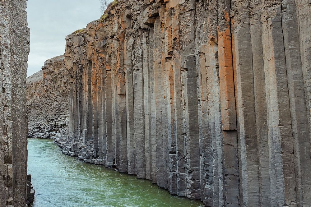 Die Stuðlagil-Schlucht ist eine beeindruckende Schlucht mit Basaltfelsen in Island. Die Farbe des Wassers kontrastiert wunderschön mit der Farbe der Felsen