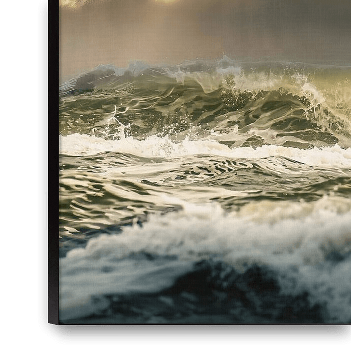 Auf dem Bild sehe ich eine beeindruckende Szene eines tobenden Meeres während eines Sturms. Die Wellen sind hoch und mächtig und rollen auf den Betrachter zu. Der Himmel ist dunkel und bedrohlich. Doch in der Ferne, hinter dem tobenden Meer, bricht eine wunderschöne untergehende Sonne durch die Wolken und färbt den Himmel orange, rot…