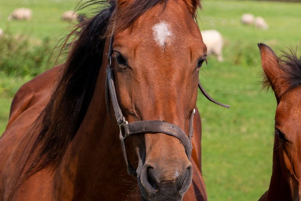 Stute und Fohlen auf der Wiese in Amsterdamsche veld bei Emmen in Drenthe