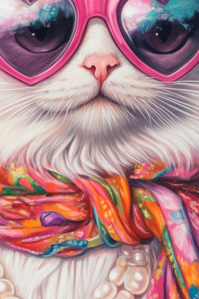 Mit einem Hauch von Glamour präsentiert sich dieser schneeweiße Stubentiger, der in schillernden Herzbrillen und einem bunten Schal geschmückt ist. Perlenketten um den Hals unterstreichen seinen exquisiten Stil und verleihen ihm einen Hauch von Extravaganz. Der sanfte Rosa-Himmel im Hintergrund hebt seine Persönlichkeit und sorgt für eine fröhliche Atmosphäre.