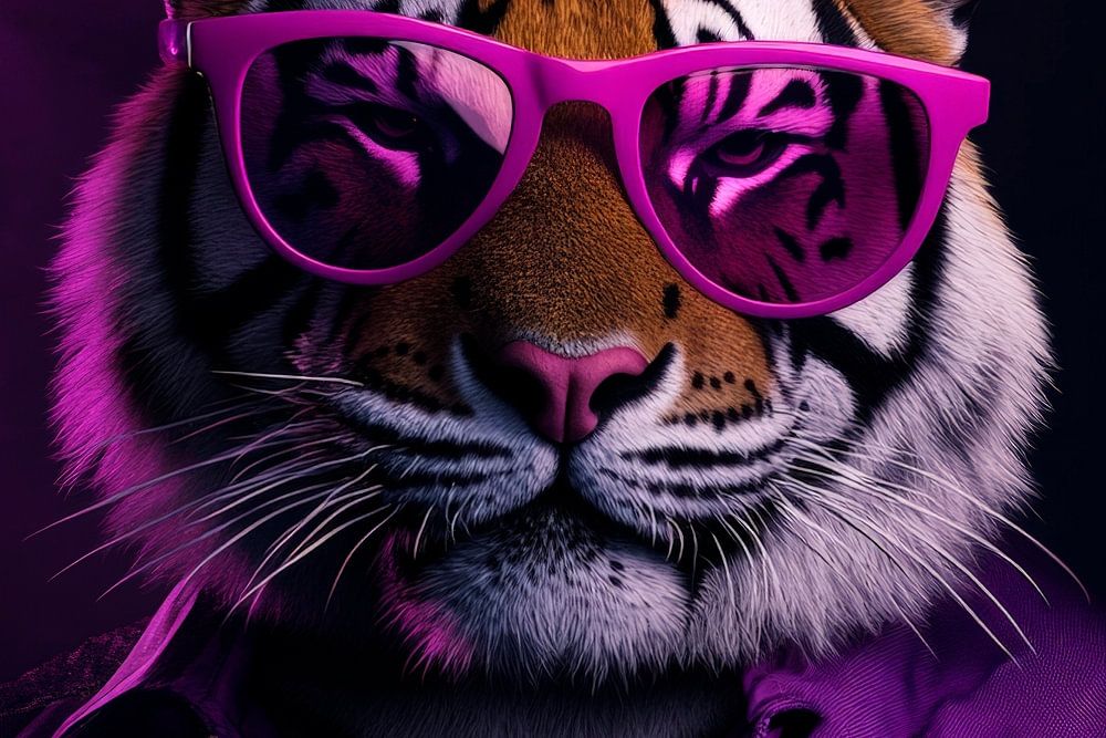 Ein lebendiger Tiger mit übergroßen, pinken Sonnenbrillen und einem stylischen lila Hemd strahlt Coolness und Selbstbewusstsein aus. Die Kombination aus Wildheit und urbanem Flair sorgt für einen auffälligen Akzent in jedem kreativen Raum. Diese farbenfrohe und außergewöhnliche Darstellung eignet sich perfekt für ein modernes Wohnzimmer oder ein inspirierendes Büro.