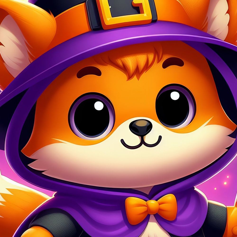 Dieses bezaubernde Bild zeigt einen Cartoon-Fuchs, der sich für Halloween verkleidet hat. Der Fuchs trägt einen lila Zauberer Hut mit einer goldenen Schnalle und einem passenden lila Umhang über einem schwarzen Anzug mit einer Fliege. Er hält eine Zuckerstange in der einen und einen Kürbiseimer in der anderen Hand, bereit für Süßes oder Saures. Der Hintergrund ist eine lebendige Nachtszene mit Vollmond, Fledermäusen, Sternen, Kürbissen und festlichen Dekorationen. Die großen, ausdrucksstarken Augen und das süße Lächeln des Fuchses machen es unmöglich, ihn nicht zu lieben.
