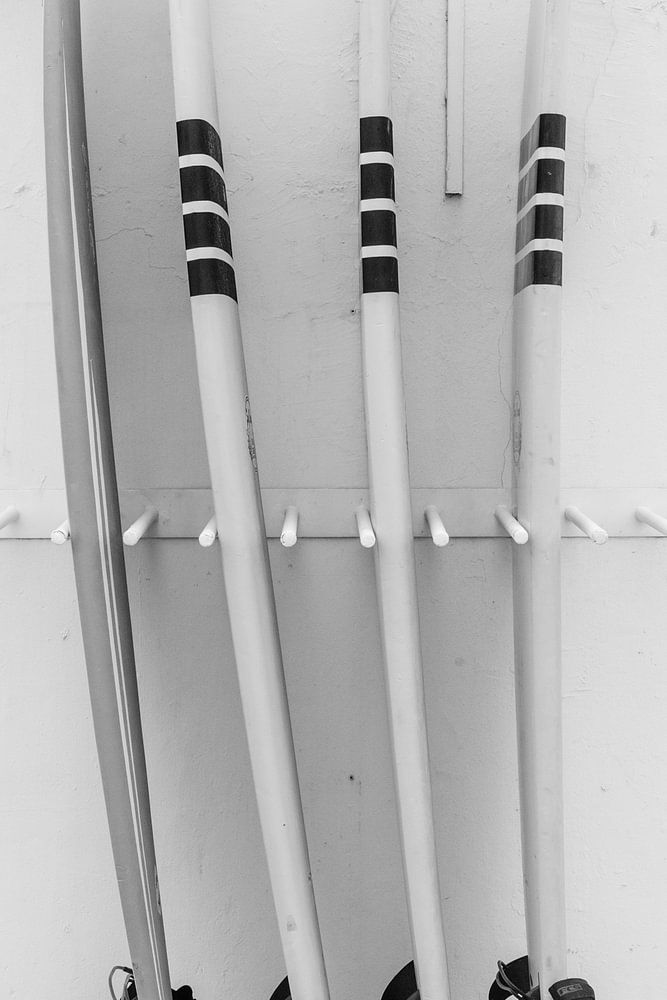 Schwarz-Weiß-Surfbild für die Wand. Vier Surfbretter stehen in einem Gestell vor der weißen Wand eines typischen bretonischen Hauses. Bereit zum Surfen, zum Fangen von Wellen und zum Erleben von (Surf-)Abenteuern auf dem Meer.