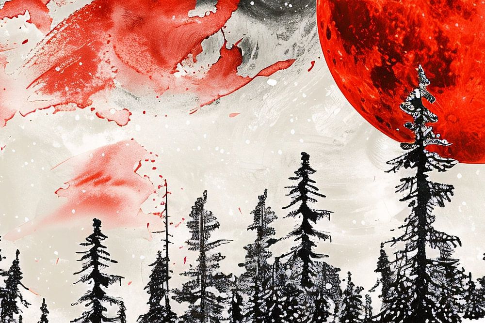 Dieses Kunstwerk bringt eine einzigartige Atmosphäre in jeden Raum. Mit einem großen, feurigen Blutmond am Himmel und dunklen, detaillierten Bäumen, die sich von dem hellen Schnee abheben, schafft das Design eine surreale Winterlandschaft. Die Rot- und Schwarztöne vermischen sich dynamisch und verleihen der Szene einen dramatischen Kontrast. Dieses Gemälde ist ideal für Liebhaber moderner und abstrakter Kunst, die auf der Suche nach etwas Einzigartigem und Faszinierendem sind. Es bringt eine geheimnisvolle und beeindruckende Atmosphäre in einen Raum und eignet sich gut als Blickfang in Büros oder Wohnzimmern. Perfekt, um einen starken visuellen Akzent in jedem Interieur zu setzen.