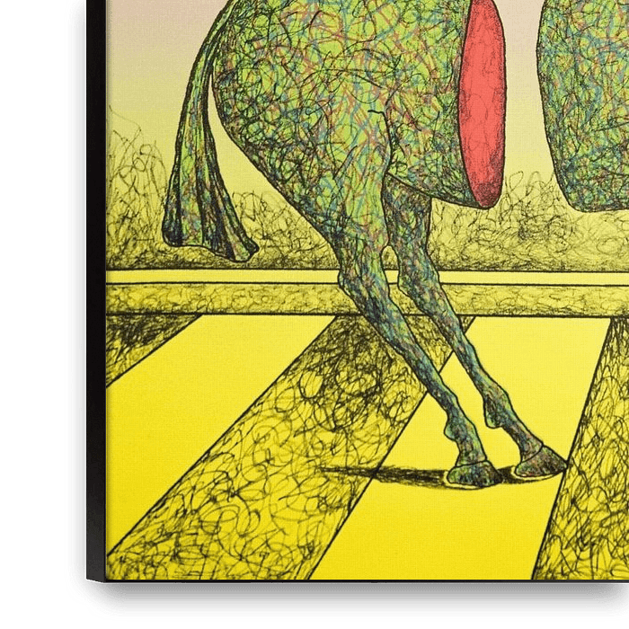 Eine Lithographie eines surrealistischen Pferdes in einem Raum. Ein farbenfrohes grafisches Bild.