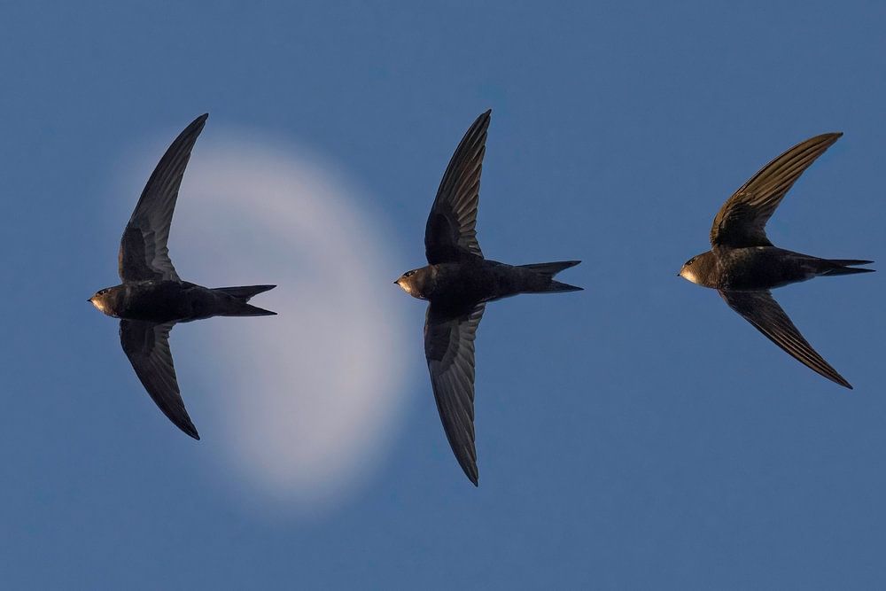Mauersegler fliegen im Sommer ständig an unserem Haus vorbei. Sie haben ihre Nester in der Nähe einer Dachrinne. Diese besonderen Vögel zu fotografieren ist eine Herausforderung für sich, denke ich. Abends, wenn das Licht nicht mehr so üppig ist, gleiten sie durch die Luft und fangen Insekten. Vor allem, wenn es in der Nähe Nester gibt, ziehen sie Kreise und rufen sich ständig gegenseitig in der Gegend zu. Wenn man bedenkt, dass diese ewigen Flieger außer zum Ausbrüten ihrer Nester nicht fliegen, ist das ziemlich außergewöhnlich. Während ihrer langen Gleitflüge macht so ein Vogel fast alles in der Luft, wie Essen, Trinken, Schlafen und so weiter. Ich kann ihnen stundenlang fasziniert zuschauen. Mit der aufgestellten Kamera versuche ich immer, das Besondere einzufangen. In der Serie 'Kunst des Fluges' konnte ich ihn beim Fliegen vor dem Mond einfangen. Wenn ich so fliegen könnte, bekäme ich höchstens eine Fliege in mein Auge als in meinen Mund. Vögel können richtig sehen und mit Leichtigkeit essen.
