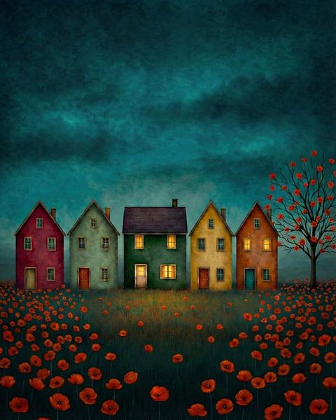 Unter dem türkisfarbenen Himmel des Tages stehen die Häuser still, ohne etwas zu sagen. Die Mohnblumen leuchten in einem tiefen Rot, doch die Fenster sind Augen, die nur schlafen. Dann fallen Schatten, schwer und weit, und beleuchten eine goldene Erinnerung an die Vergangenheit. Eine einsame Lampe beginnt zu brennen und wartet auf…