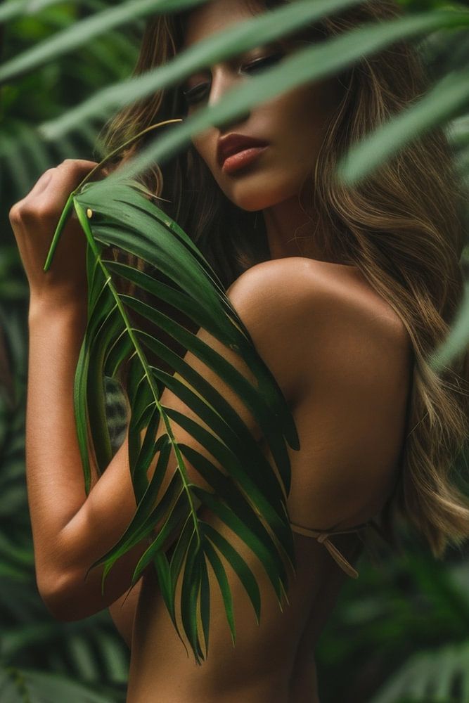 Im üppigen Grün eines tropischen Dschungels steht eine anmutige Silhouette im Fokus. Sie versteckt sich hinter einem großen Blatt, was eine geheimnisvolle Stimmung erzeugt. Ihr minimaler Schmuck hebt die natürliche Schönheit hervor, während das sanfte Licht durch die Blätter scheint und eine harmonische Verbindung zwischen Mensch und Natur schafft.