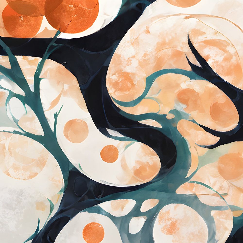Dieses Kunstwerk fängt die Essenz abstrakter und moderner Kunstbewegungen ein, mit Einflüssen aus der surrealistischen und organischen Kunst. Die verspielten Formen und Farbkombinationen rufen ein Gefühl von Bewegung und Lebendigkeit hervor. Die kontrastierenden dunklen und hellen Töne der Zweige und orangefarbenen Kreise schaffen ein dynamisches Ganzes, das sowohl Ruhe als auch Energie ausstrahlt.