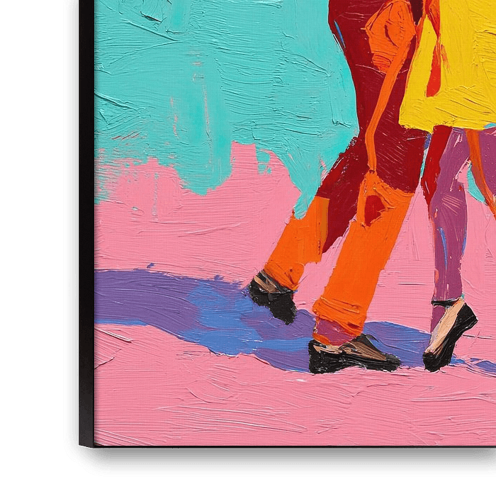 Dance Set | Joyful Dance Under Colorful Skies - Dieses romantische Gemälde zeigt eine Frau in einem gelben Kleid, die mit einem Mann in einer weißen Bluse und einer auffälligen orangefarbenen Hose tanzt, vor einem Hintergrund aus sanften Rosa- und Türkistönen, der eine energiegeladene und fröhliche Atmosphäre schafft.