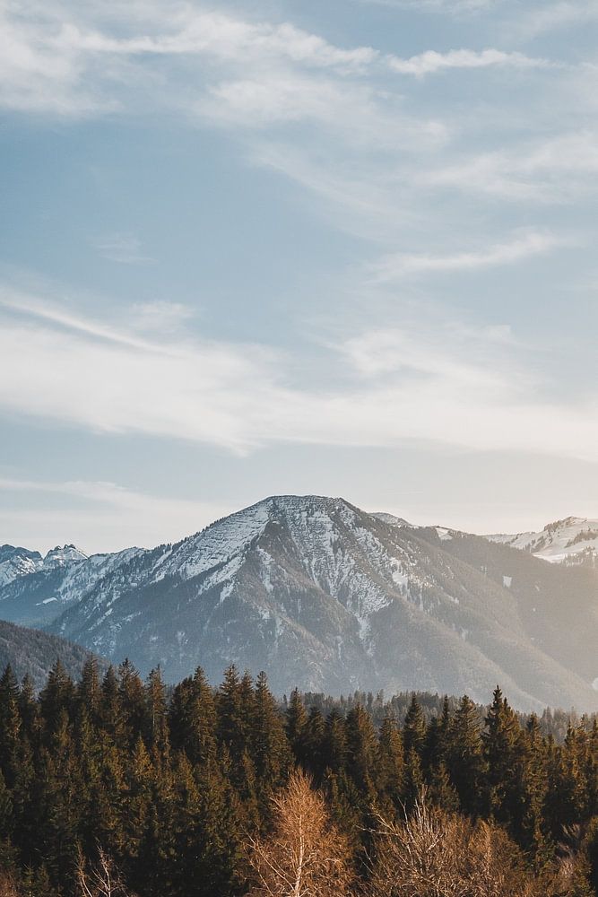 Winter in den Alpen: schneebedeckte Berggipfel, hohe Tannen, beeindruckende Felsformationen, eine tiefstehende Sonne und ein klarer blauer Himmel.