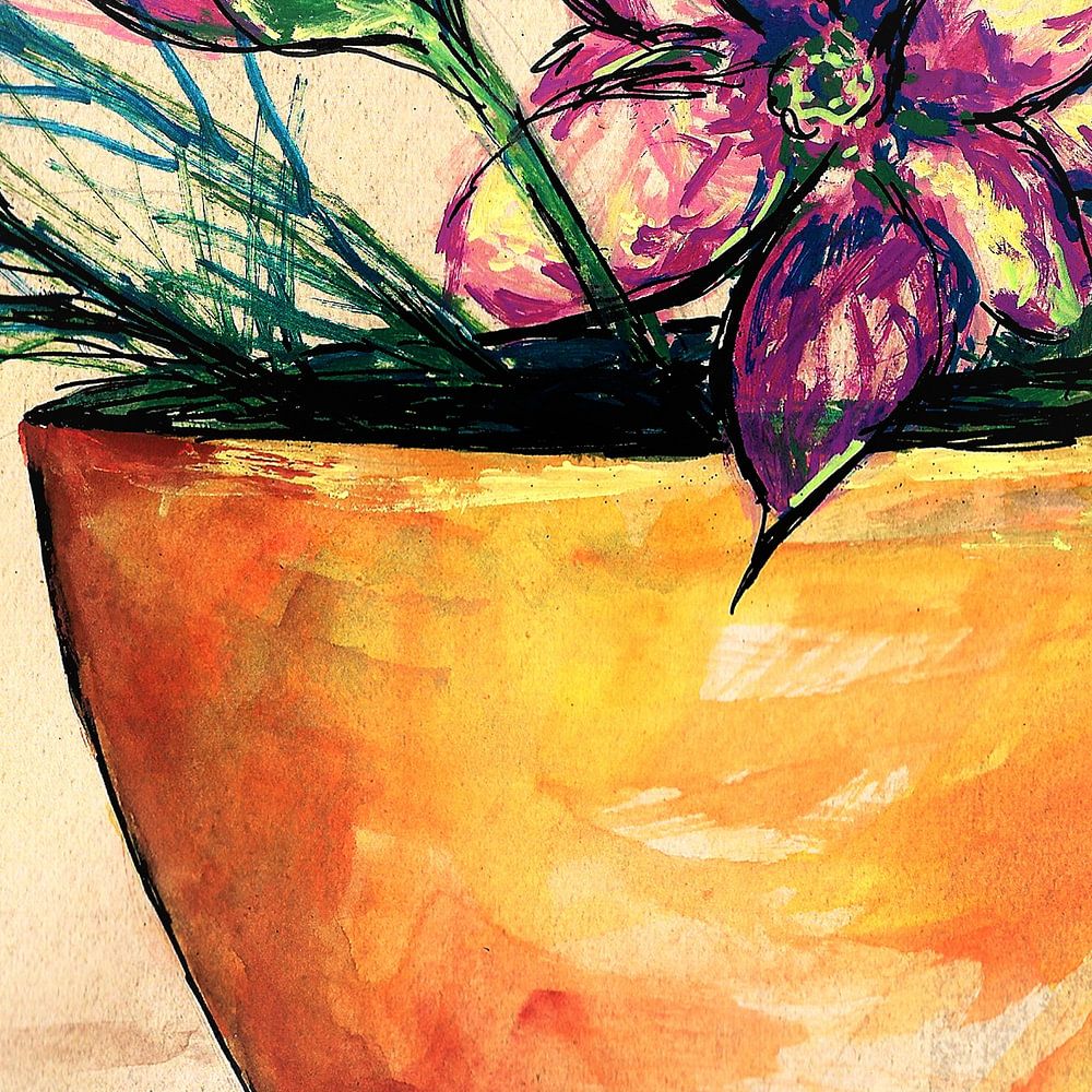Handbemaltes Aquarell eines abstrakten Terrakotta-Blumentopfes mit grün-blauen stilisierten Zweigen mit rosa-lila Blumen. Die Vase und die Blumenzweige sind als Strichzeichnung gezeichnet, so dass es glatte moderne Malerei s aussehen. Das Sonnenlicht scheint auf den Blumentopf und macht es leuchten. Es handelt sich um ein Gemälde im japanischen Stil, eine Kombination aus japanischem und skandinavischem Stil, abstrakt und figurativ mit wenig Farbe. Passt gut in ein modernes Interieur. Sie finden dieses Gemälde in meinem Album Vasen und Töpfe, hier finden Sie weitere Gemälde mit Vasen in verschiedenen Stilen. Es kann auch in den Alben gefunden werden; Vasen und Töpfe / Blumen / Stillleben / Abstrakte Kunst / Japanische und orientalische Kunst / Figurative Kunst / Illustration